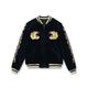 岩場に鎮座する虎を描いた作品。マットなダークネイビーの別珍生地に光沢感のあるレーヨン糸のイエローが際立っている。程よくデフォルメされた虎の刺繍は他のヴィンテージスカジャンの刺繍に比べて一回り大きく、インパクトある仕上がり。特徴的な書体の「JAPAN」の文字や、通常より縦に長い袖の昇龍もポイント。 リバーシブル面はブラックの単色ボディに日本地図を描いたジャパンマップ柄。朝鮮半島も併せて描かれていることから1950年代中期の作品であることがわかる。富士山や龍などのモチーフも加え、赤い桜を背面の中心に配してアクセントとしており、その完璧なバランスに当時の職人のセンスが感じられる。 |